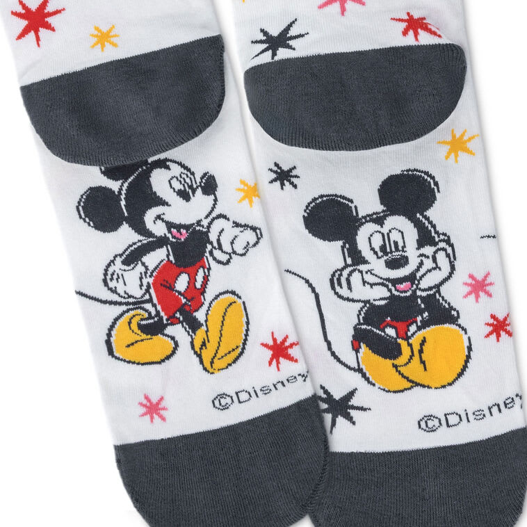 Strut your stuff with Disney’s Mickey Mouse dancing around your ankles and delighting your fashion sense. These white socks feature illustrated designs of Mickey in strolling, sitting, and standing poses, surrounded by colourful stars in black, red and yellow. Black accents at the cuffs, heels, and toes add a touch of cheeky sophistication. Sized for adults, this pair of Disney novelty socks makes a fun addition to your own collection or a charming gift for any Mickey Mouse fan.