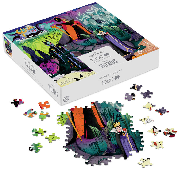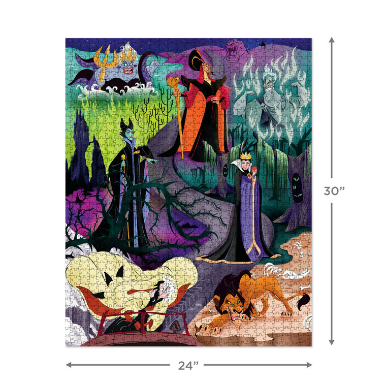 Rein in your need to control chaos when you put together this fiendish 1000-piece puzzle featuring Disney Villains. Celebrate the best of the big Disney baddies in their element as you piece together the colourful scene. The collage-style puzzle includes Ursula the Sea Witch riding a wave, Jafar striking a pose in front of the Cave of Wonders, a smoking hot Hades in a flex, Maleficent showing off her green thumbs, the Evil Queen with a red delicious snack, Scar on the prowl and Cruella de Vil riding roughshod down a road. This delightfully devilish puzzle makes a great rainy day activity for Disney aficionados and puzzle fanatics alike.