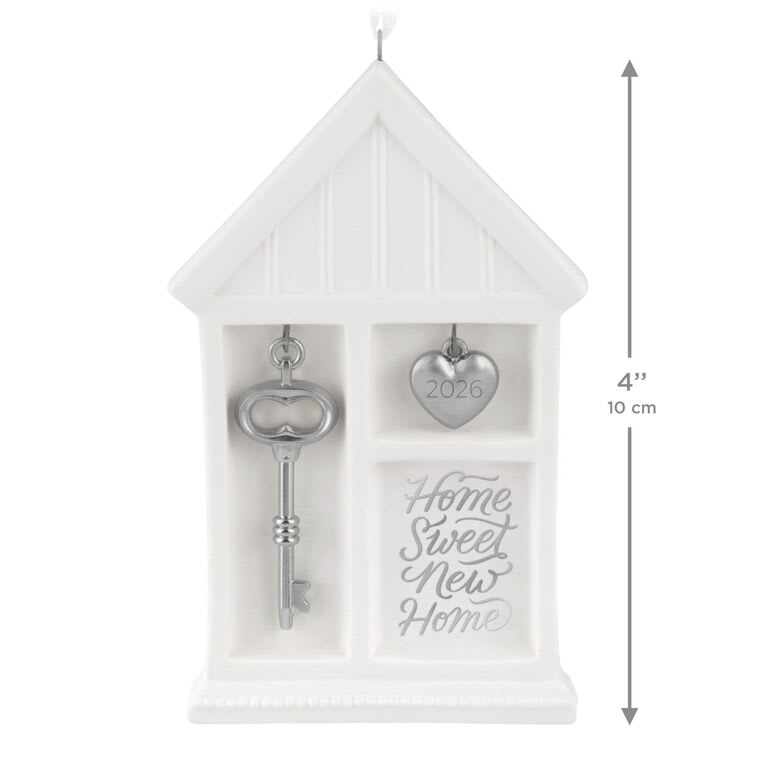 Enjoy your first holiday season in the cozy comforts of your new home. Celebrate with this charming Christmas tree ornament that will always remind you of that special first year in your new abode. The white porcelain decoration shaped like a house holds a silver metal key and a year-dated heart charm, accented with a sweet sentiment. This 2026 Keepsake makes a great housewarming gift for first-time homeowners.