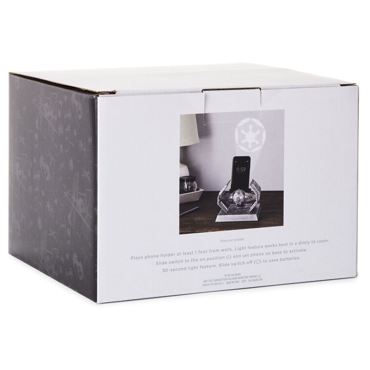 Project an always-in-command persona when you place this Star Wars Darth Vader TIE Fighter phone holder on your desk or work station. Darth Vader's starfighter phone stand not only holds your phone in a secure grip, it also projects an Imperial insignia in blue light on a wall behind the holder. This dimensional starfighter phone stand makes a great gift for any Star Wars fan.