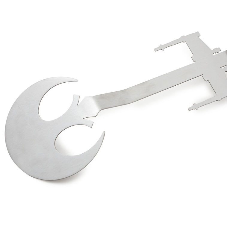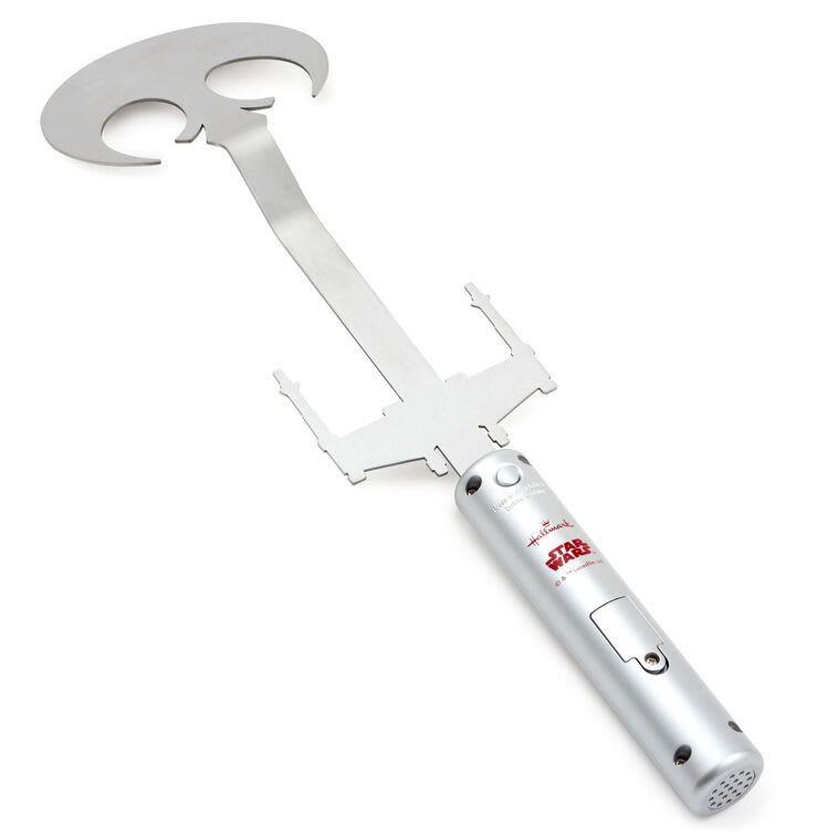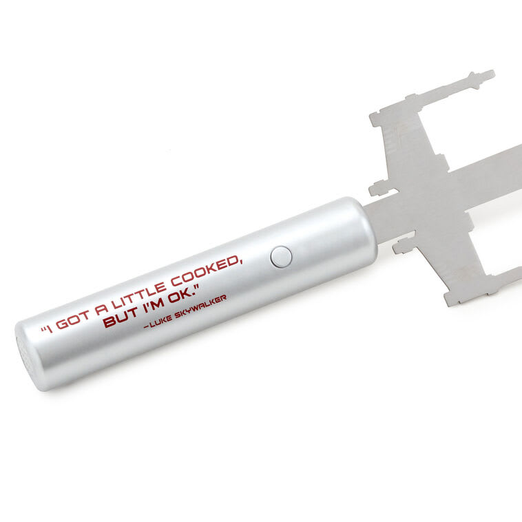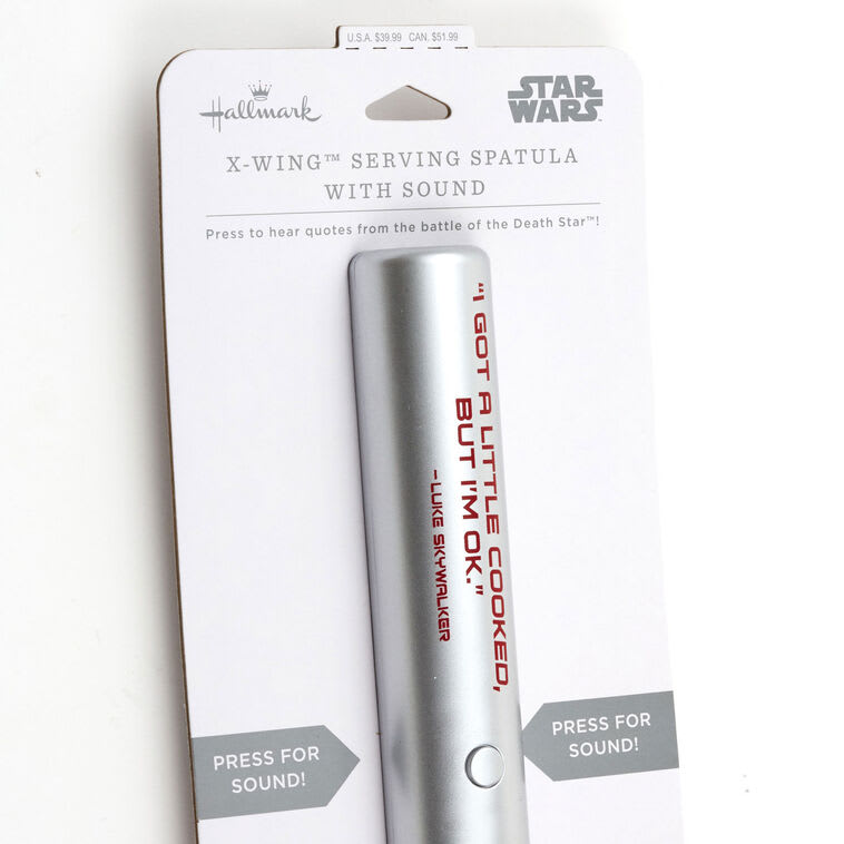 Go in with a blast when it comes to flipping a pancake onto their plate or doling out pizza slices or burger patties with this Star Wars serving spatula with sound. Serving utensil features a Rebel insignia design on the base and a button on the handle that plays one of five iconic Luke Skywalker™ quotes from the Battle of Yavin in Star Wars: A New Hope.